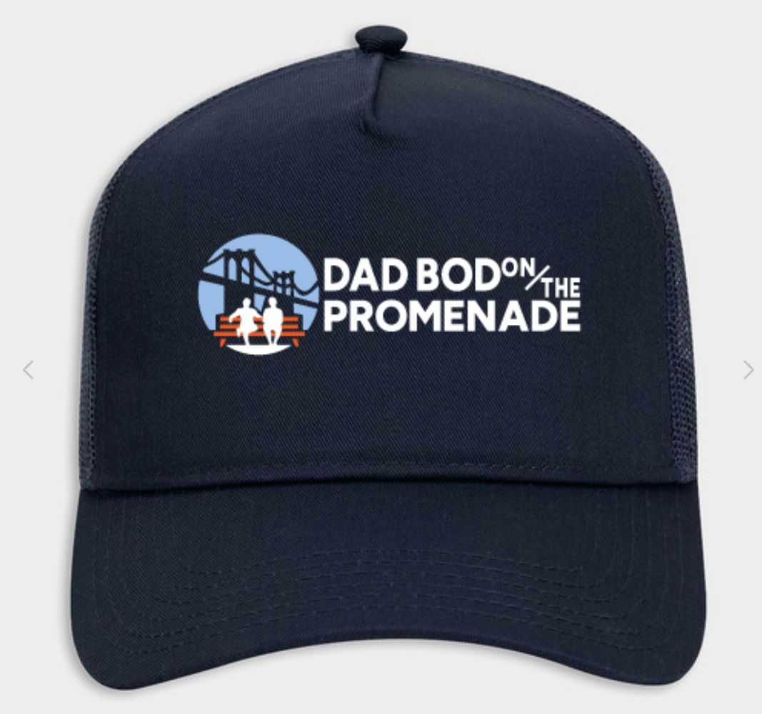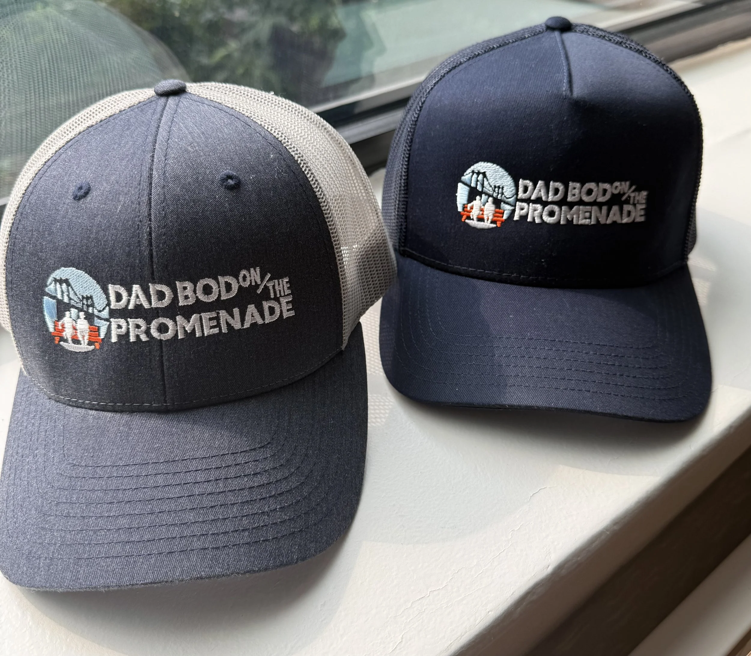 A blue and gray trucker cap with the logo and text "Dad Bod on the Promenade" featuring a bridge silhouette and two running figures.